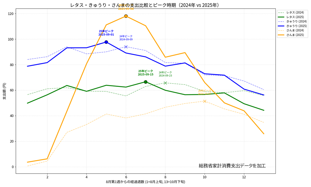 多田:2025年の例でいうと、秋を代表する食のひとつ、サンマが例年より2週間ほど早く8月末や9月頭から店頭に並びました。店舗の販売担当者の話では、その後によく動いた商材は秋の味覚だったそうです。外気温は35度を超えるような時期であっても、サンマを食べたことで気分や味覚は秋に変わったのでしょう昨年の家計消費支出のデータを見ると、毎年9月後半頃まで消費のピークが続くサラダの材料が2週間ほど早めにピークアウトした様子もあり、売り場に並ぶ商材が、生活者の季節感を引っ張っていることが想定できます。