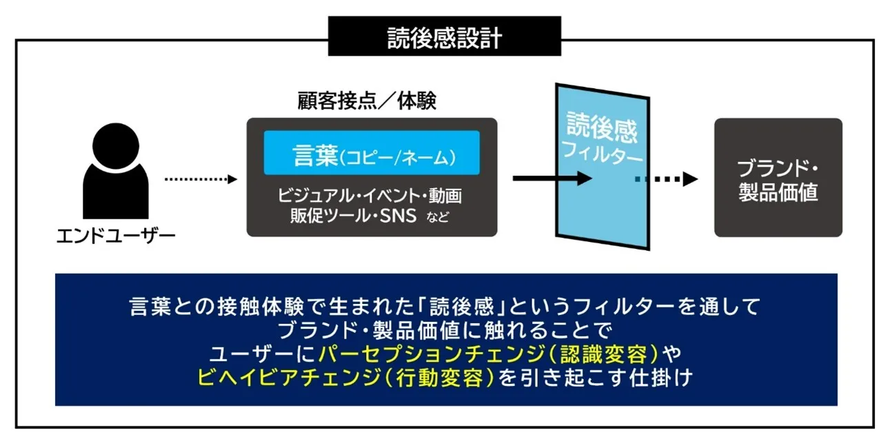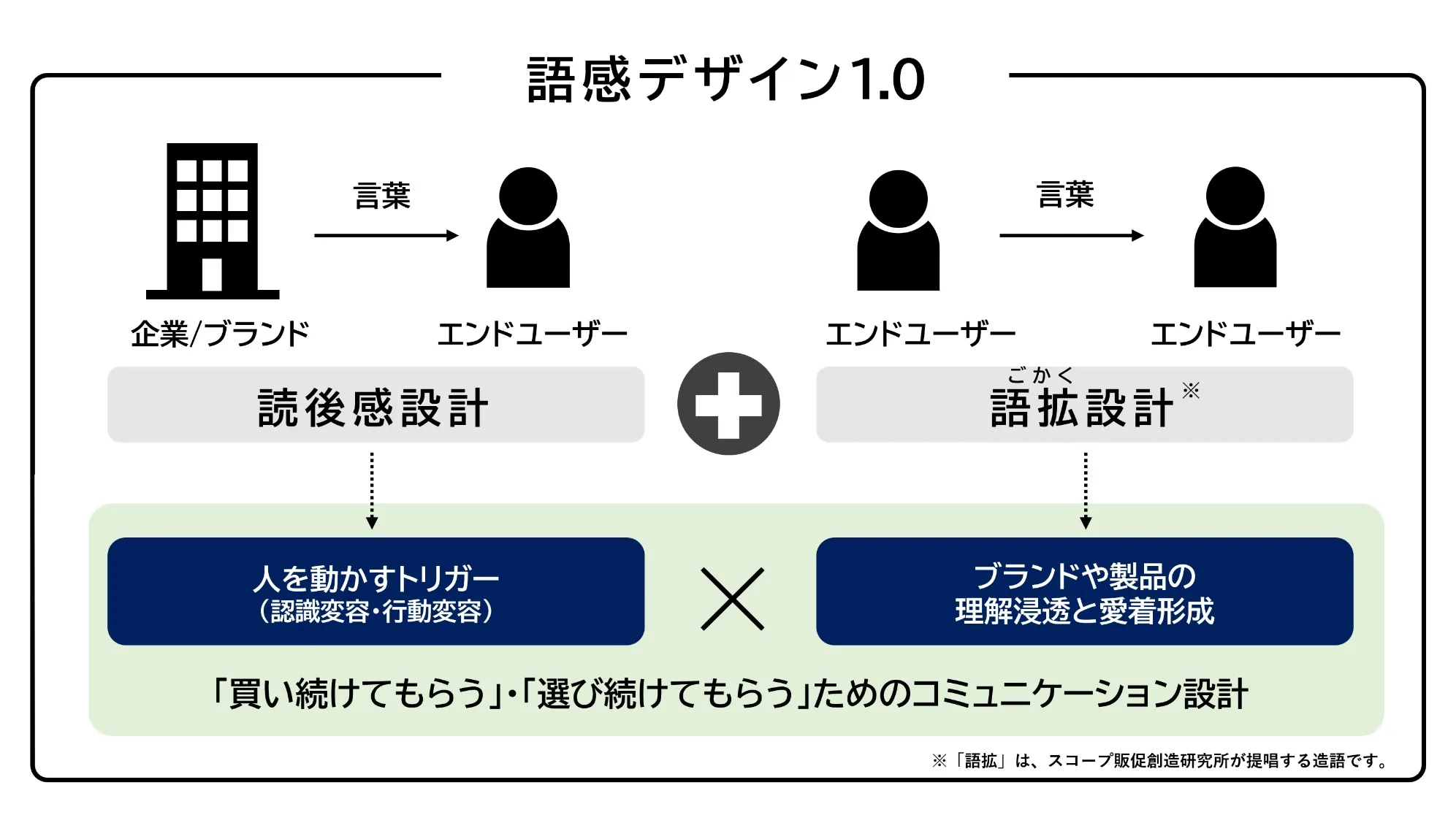 「語感デザイン」は、スコープ販促創造研究所が体系化に着手し始めた独自理論です(図1)。企業やブランドから消費者に向けて。消費者から消費者に向けて。言葉に触れる体験を通じて生まれる感情こそが認識変容・行動変容を促すトリガーとなり(図2:「読後感設計」)、さらにはその言葉を波及、あるいは転換させることで、ブランドや商品の理解浸透と愛着形成にまで影響を及ぼすと捉え(図3:「語拡設計」)、一連の体験設計の構造を総称して「語感デザイン」と呼ぶことにしました。