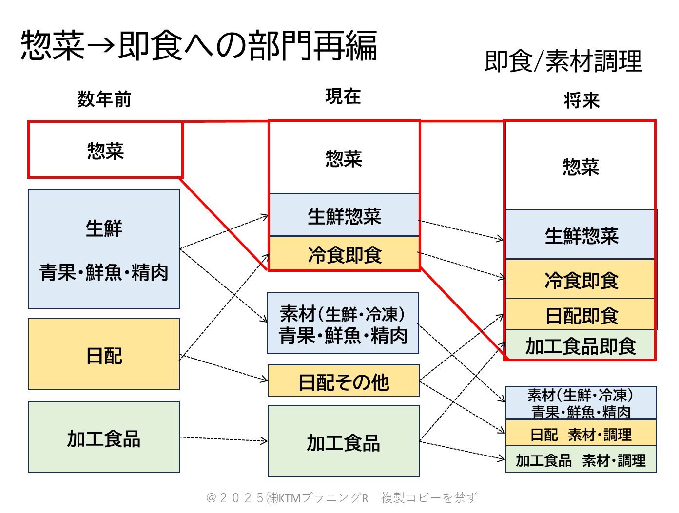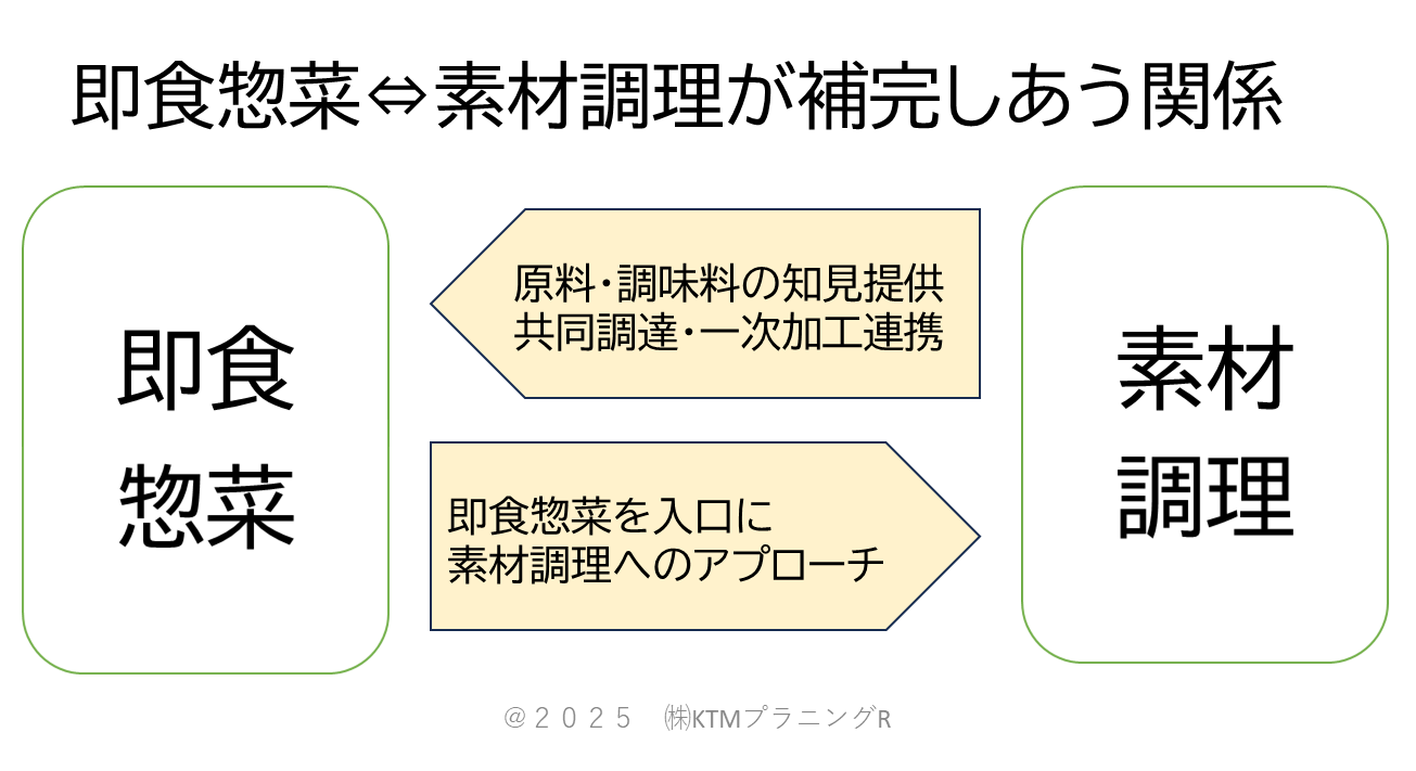 「生鮮惣菜」「冷凍惣菜」といった言葉が生まれるなど、もはや惣菜は惣菜部門だけにとどまらなくなってきています。今後長い目で見ると食品売場は「即食(惣菜含む)」「素材調理」に二分されていくはずです。