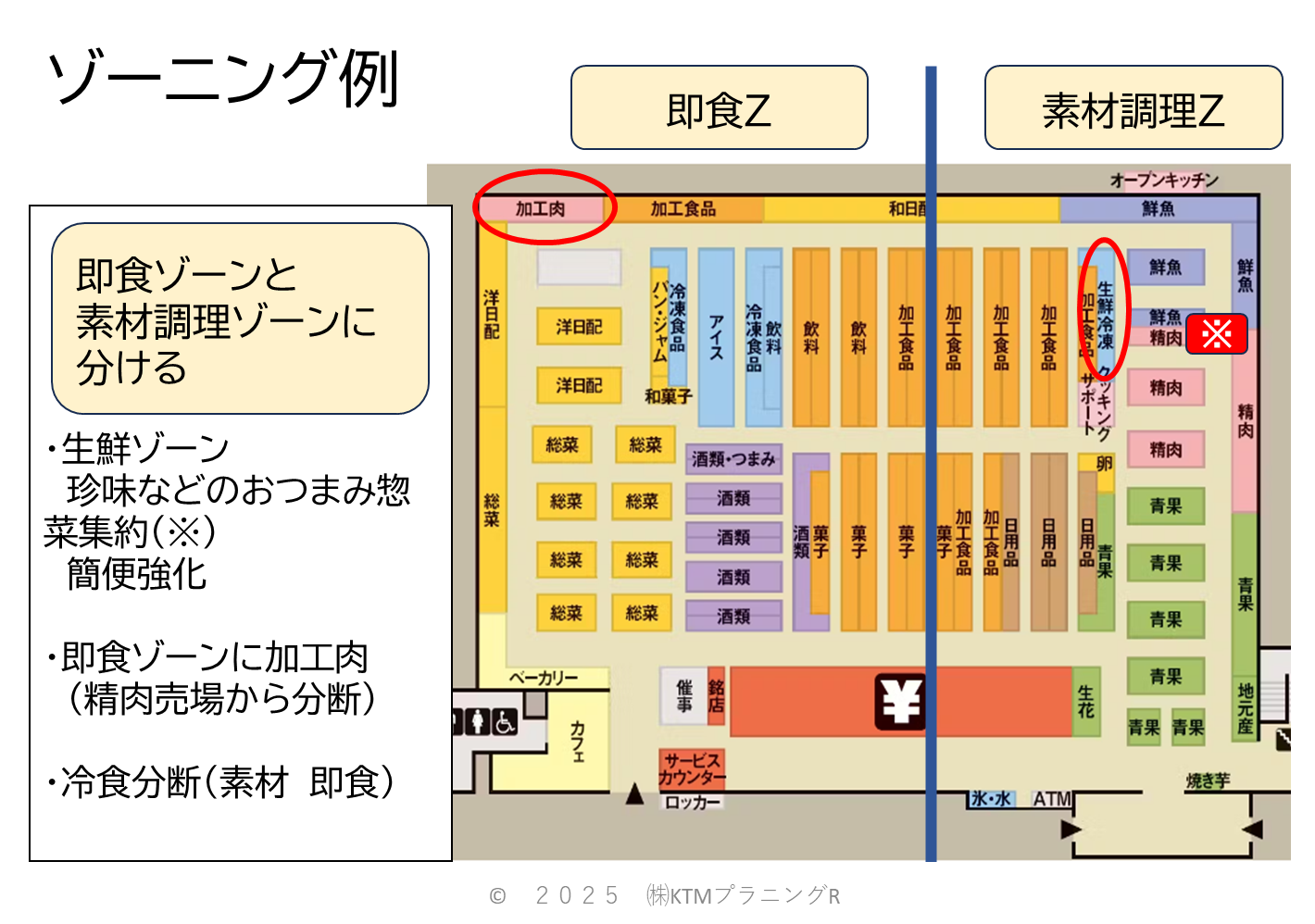上の図はあくまでイメージとして作成したものですが、実際にこのゾーニングを採用している店舗の一つにライフムスブ田町店があります。売場の両端に出入り口が一つずつあるライフムスブ田町店では、JR田町駅側を即食ゾーン、芝浦側を素材調理ゾーンとして展開し、客層に分けた棲み分けがなされています。